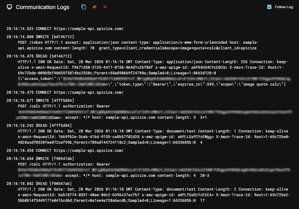 Click on the Toolbar button to view HTTP reads and writes. This log is global for Apicize, it reflects communication for all active Workspaces.