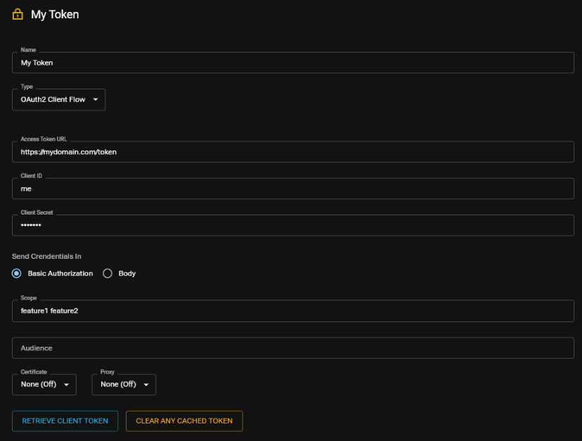 When authorizing using OAuth2 Client Flow, a call is made to the specified Access Token URL with the Client ID and Secret to receive a token. Optionally, you can specify a Scope. When associating an OAuth2 Client Authorization parameter, Apicize will automatically retrieve the token, and reuse it until either it expires, or you click on "CLEAR ANY CACHED TOKEN" in the Authorization's configuration.