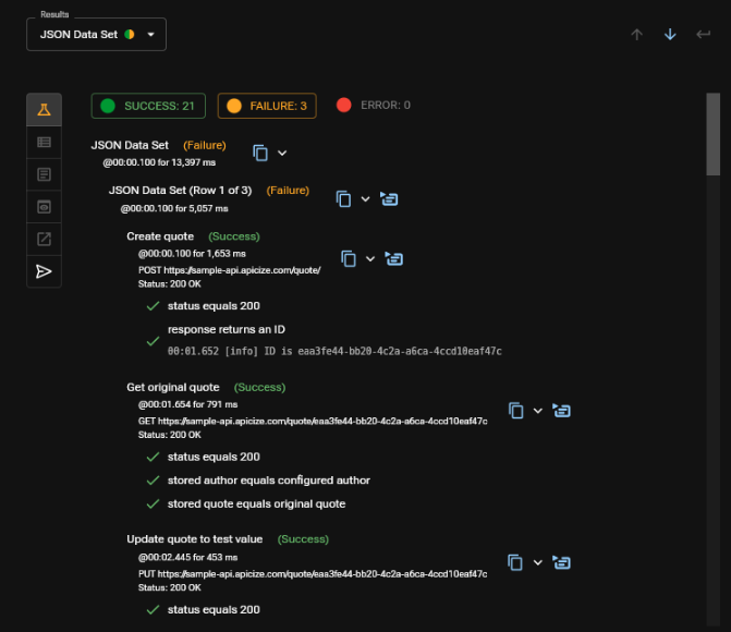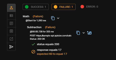 After a request is processed, the results will be shown to the right of the request. The test flask icon colors indicate success or failure.