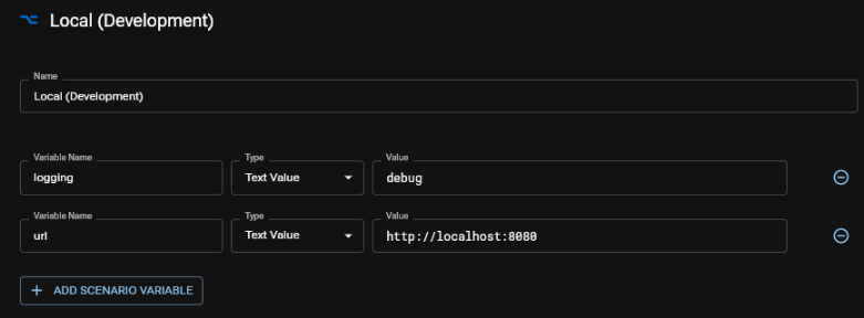 A Scenario is a set of variables that are available when testing requests. These can be set for any Request or Group. If they are set for a Group, they will apply to all child Requests or Groups. At the simplest level, you can use this capability to inject different values into the same Request(s), without having to modify them. These values can be used as the URL, in query string variables, headers, the body, etc.